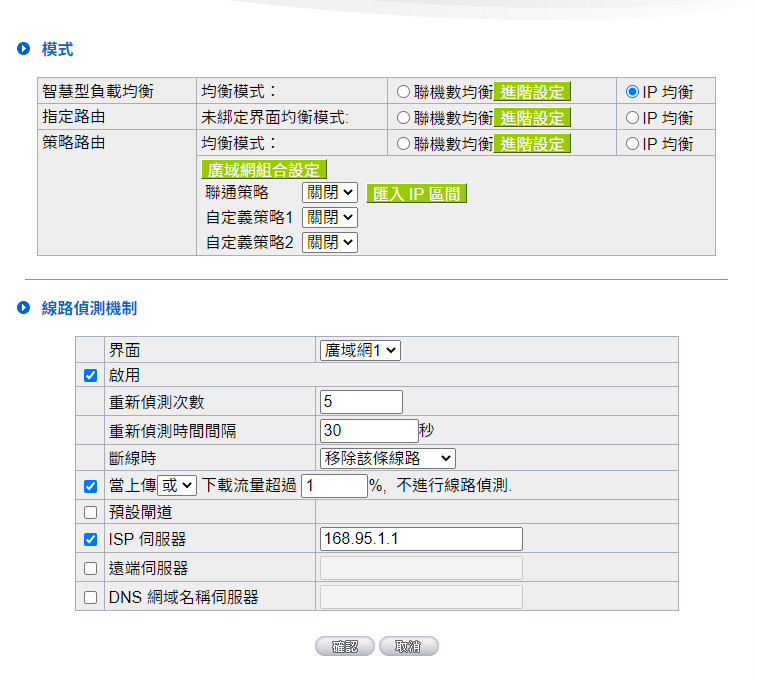 俠諾路由器接多個網路來源(中華電信adsl 或 第四台網路)時須設定線路偵測機制,斷線時將會自動切換至另一條備援線路。